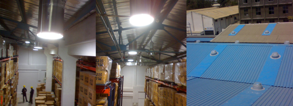 Rexam Pharma Packing India Pvt Ltd. Specializes in packaging for the pharmaceuticals industry. 24 units of Solatube Solamaster 330-O 21” diameter open-ceiling tubular skylights, installed using a metal overlay painted blue to match roof color.Project Profile PDF
